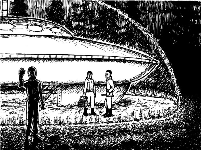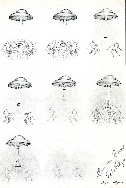 Viljo : « Soudain, le cône lumineux au sol a fondu, a flotté vers le haut comme une flamme rugissante et a aspiré dans l’ouverture du véhicule. C’était comme si le rideau obscur avait été abattu et que l’air au-dessus de nous était vide. »