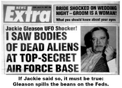 Jackie Gleason : « Je n’ai jamais vu de soucoupe volante nulle part personnellement, mais j’ai lu des ouvrages publiés sur les soucoupes volantes. La plupart de cette littérature est ridicule, mais parmi les déchets il y a des points indéniables qui ne peuvent être réfutés même par le gouvernement des Etats-Unis ».