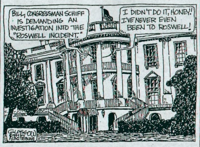 Il semble ne pas croire qu’il se soit passé quelque chose à Roswell, en 1947, mais reconnaît avec autodérision qu’il avait cependant essayé de s’informer.
