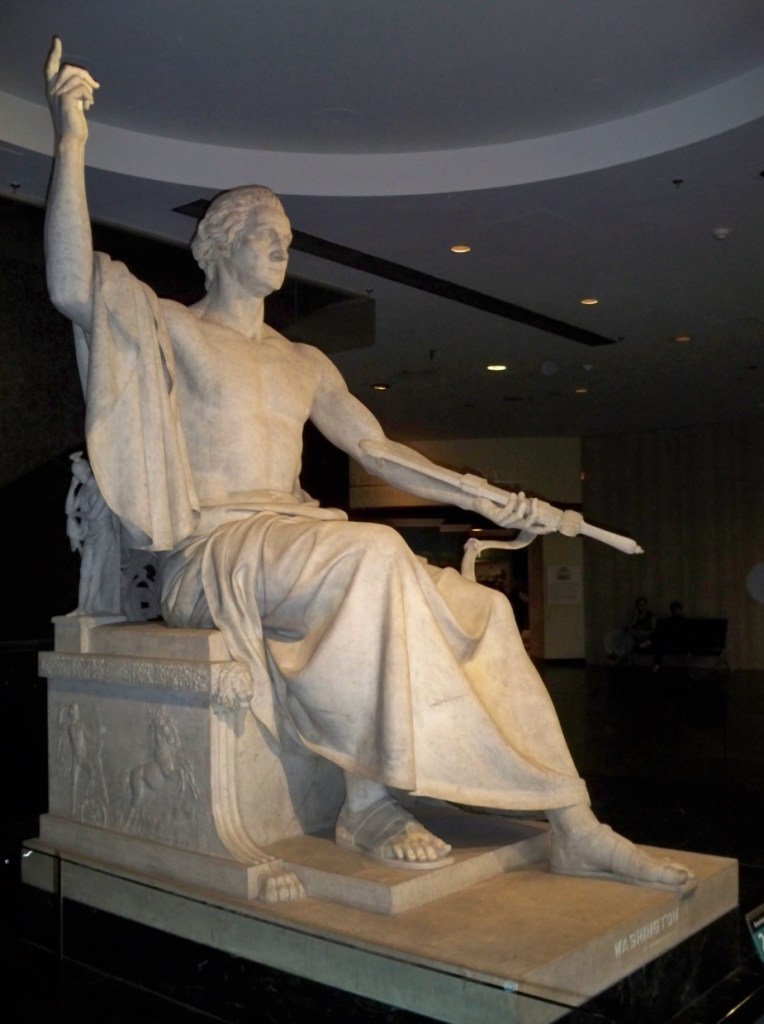 Il existe une autre représentation de Washington qui le représente spécifiquement en tant que personnage divin. Le Congrès a autorisé une incroyable statue de G. Washington par Greenough dans laquelle il est représenté par Zeus ou Jupiter. La statue avait plusieurs caractéristiques clés qui l’identifiaient comme un homme de paix et un conducteur du ciel et de la terre. Son épée est offerte au spectateur de la statue, indiquant qu’il est ici en paix. Et puis, sur les côtés de la statue, vous verrez une représentation très importante du dieu Apollon sur son char solaire ou sur son char des étoiles.