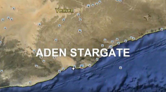 Aaron McCollum, est un soldat MKUltra, il explique dans une entrevue avec Kerry Cassidy de Projet Camelot, qu’il a participé à des opérations navales situées dans le Golf d’Aden entre le Yémen et la Somalie. Tous les navires de guerre du monde entier qui s’y trouve depuis un certain temps, supposément à cause des pirates somaliens, sont là car des anomalies magnétiques se sont révélées et tout le monde surveille cette porte des étoiles. Elle aurait été activée le 5 janvier 2010 par des extraterrestres bienveillants des hommes. Il dit qu’on peut voir un immense tourbillon à l’endroit où la porte est située dans l’eau. Il affirme aussi que des opérations sous fausse bannière auront lieu en 2010 et qu’il y aura beaucoup de morts. Il nous prévient de ne pas aller au moyen-orient et surtout pas au Yémen qui sera le « ground zero » des opérations. Beaucoup de pays seront touchés par ces opérations de supposés terroristes qui sont en fait des hommes programmés MKUltra.