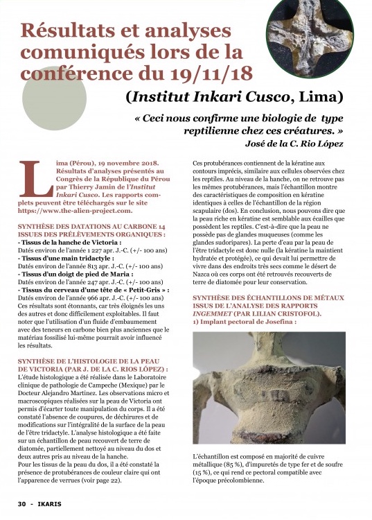 « Il y a quelques jours, les laboratoires ont confirmé à Jaime Maussan que les résultats obtenus sur Maria et Victoria étaient 100% fiables. L’ADN analysé de Victoria n’appartient à aucune espèces connue sur Terre et n’a que 4% de commun avec l’alpaga. » Thierry Jamin
