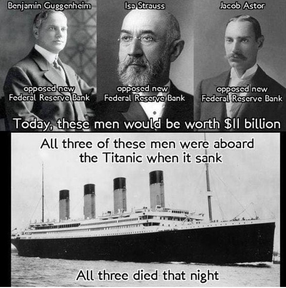 -Benjamin Guggenheim, Isa Strauss et John Astor, tous 3 opposés à la création de la Banque Fédérale (aujourd’hui ces hommes vaudraient l’équivalent de 11 milliards de $!!!).