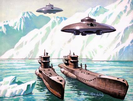 En 1938 eut lieu une expédition allemande en Antarctique menée par le porte-avions Schwabenland. Les Allemands s’attribuèrent 600.000km carrés de terrain qu’ils baptisèrent « NEUSCHWABENLAND » (Nouvelle Souabe). C’était une région sans glace avec des montagnes et des lacs. Des flottes entières de sous-marins du type 21 et 23 prirent, plus tard, la route vers le Neuschwabenland. Jusqu’à ce jour, plus de cent sous-marins allemands y disparurent. Ils étaient équipés du tuba Walter qui leur permettait de rester plusieurs semaines sous l’eau. On peut penser qu’ils se sont enfuis vers le Neuschwabenland avec les soucoupes volantes en pièces détachées ou qu’ils ont, au moins, emporté les plans de construction. On peut supposer aussi, puisque les essais en vol furent couronnés de succès, qu’à la fin de la guerre, les soucoupes volantes s’y sont rendues directement. Cette supposition peut paraître osée à plus d’un mais beaucoup d’indices importants permettent, cependant, d’imaginer que cela s’est passé ainsi.