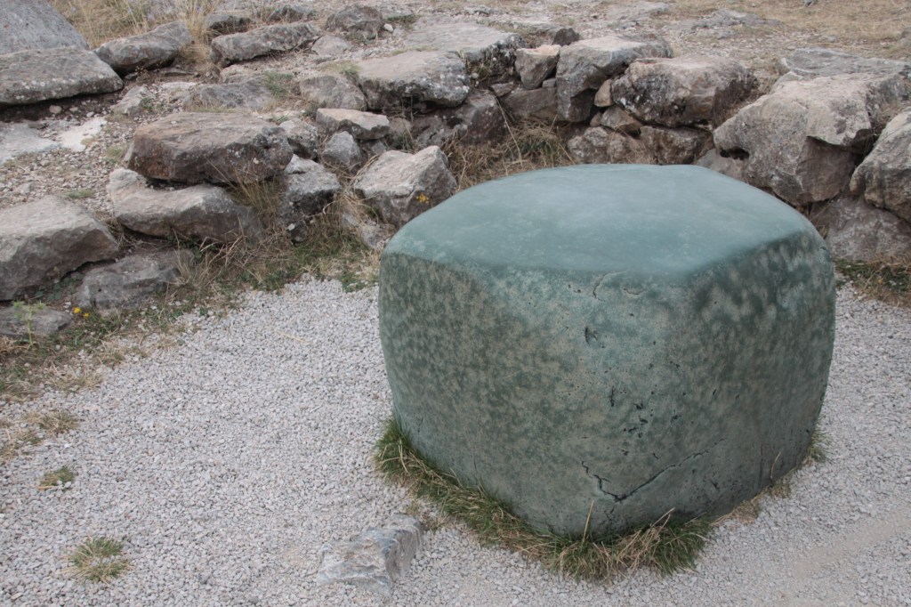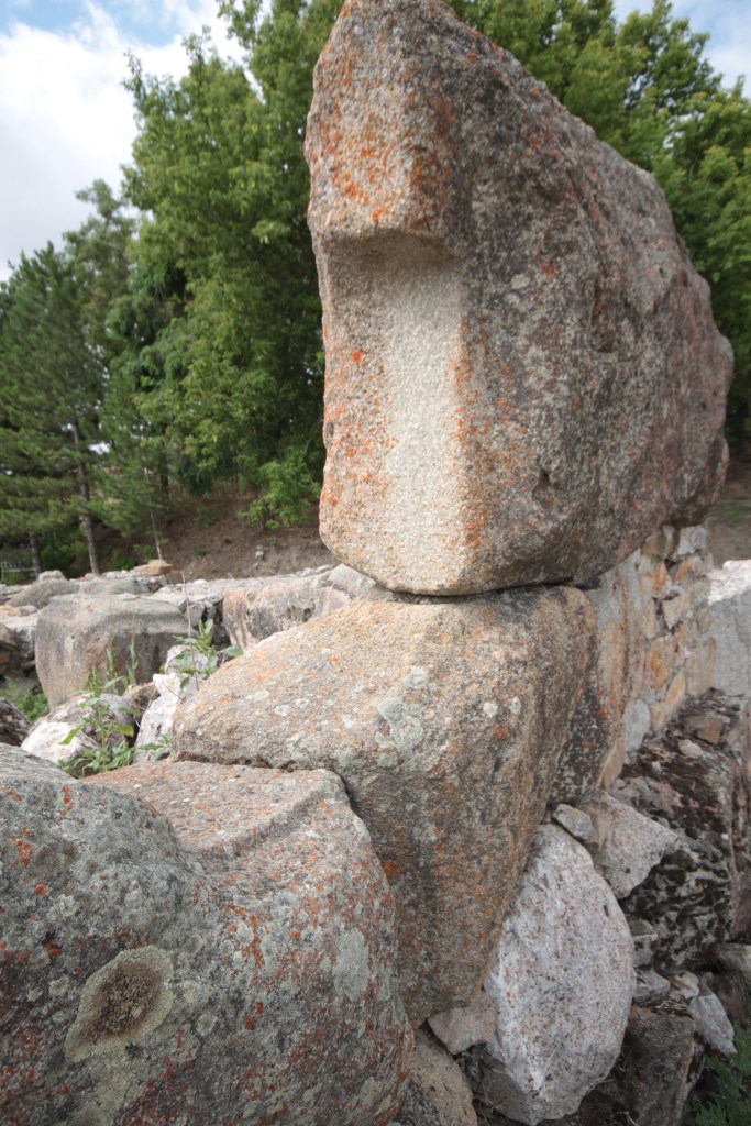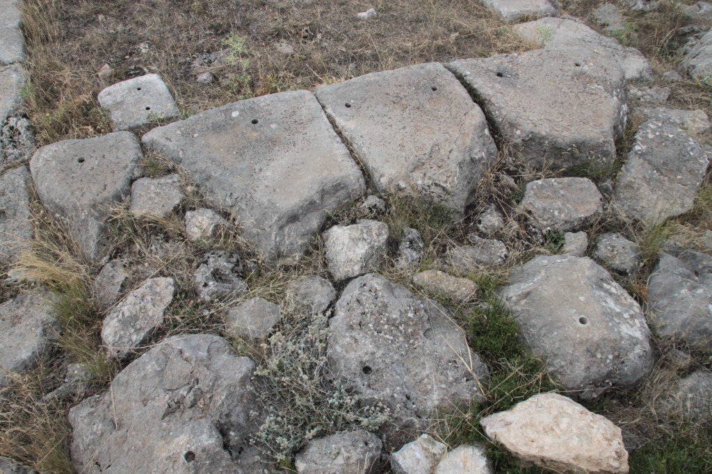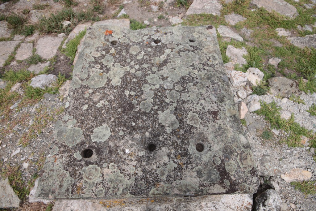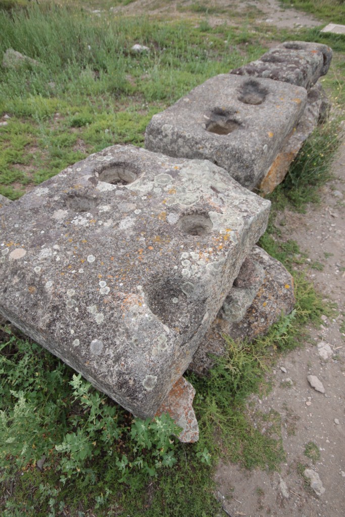 Remarquez également tous les trous bien visibles dans les pierres du sol. Ils sont la marque de l’ossature en bois qui, remplie de briques de terre crue, formait les murs du temple. Les Hittites utilisaient des « perceuses » en bronze, sacrément efficaces!