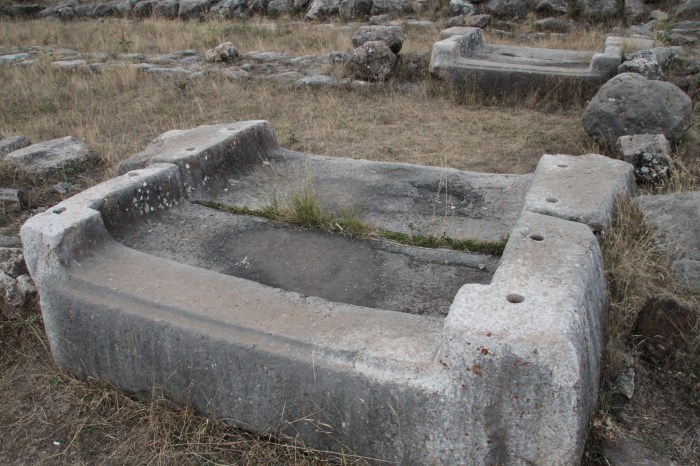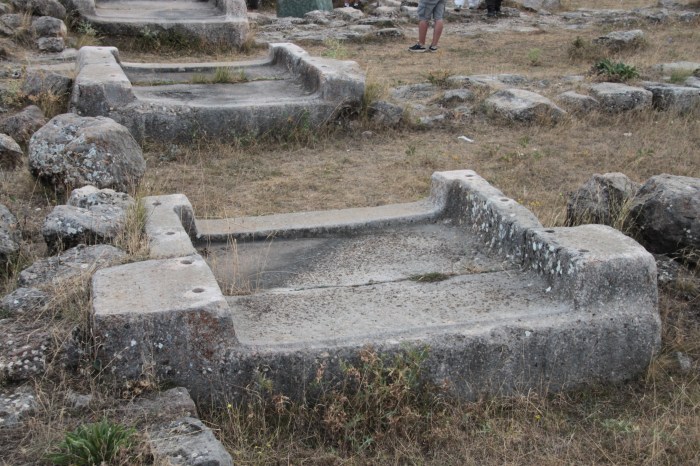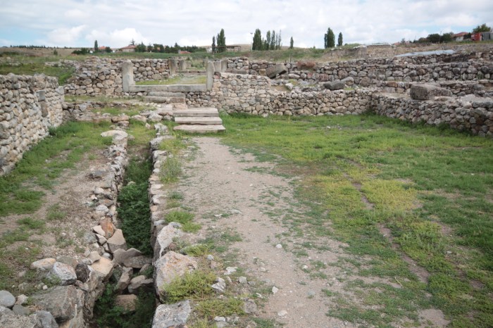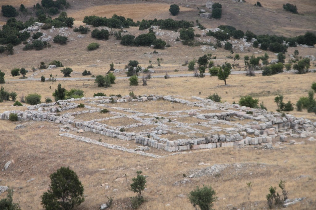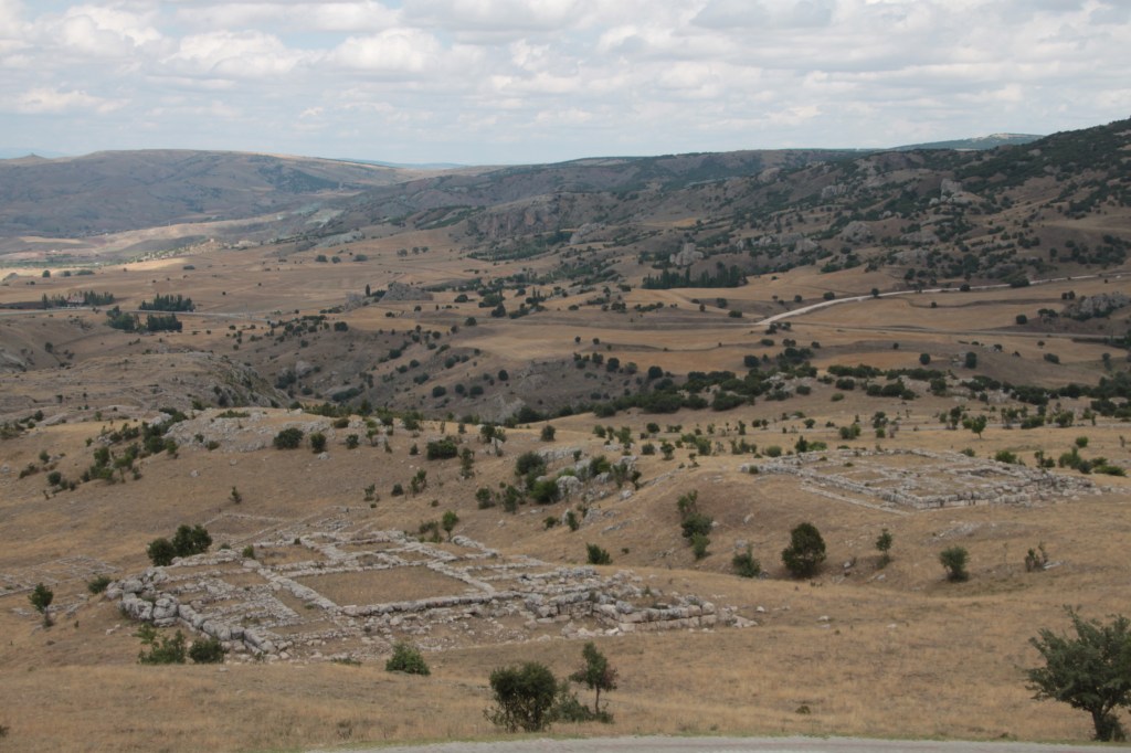 Le grand temple de Hattusa mesure 160m par 130m. On en voit encore très bien l’entrée, le sol pavé et la base des murs en pierre. Il faut s’imaginer à l’époque, une cour centrale et différentes pièces autour :