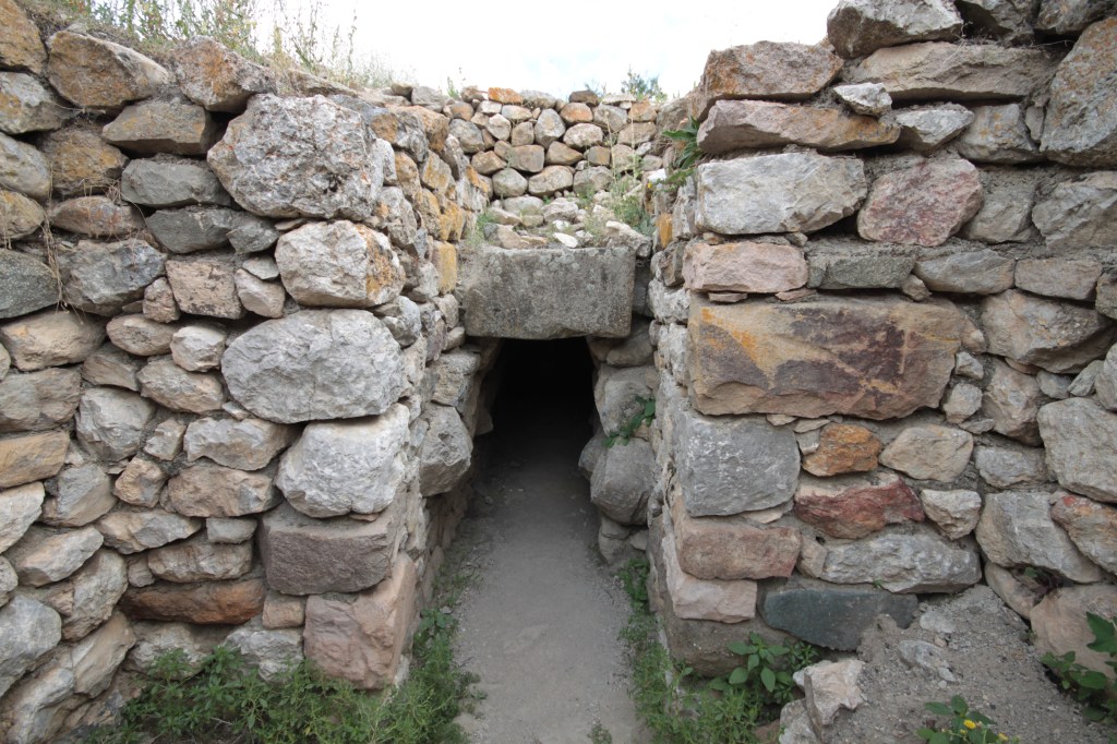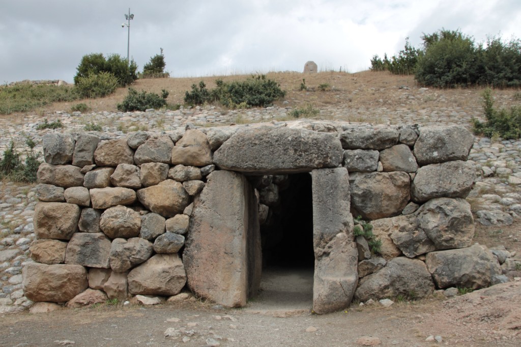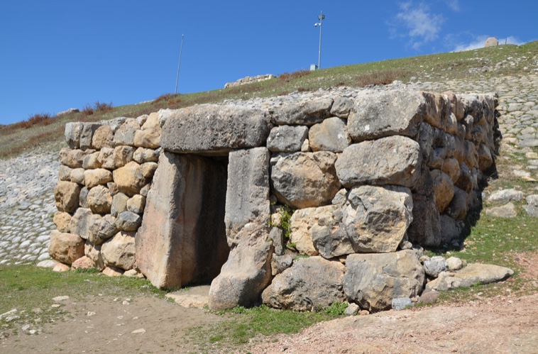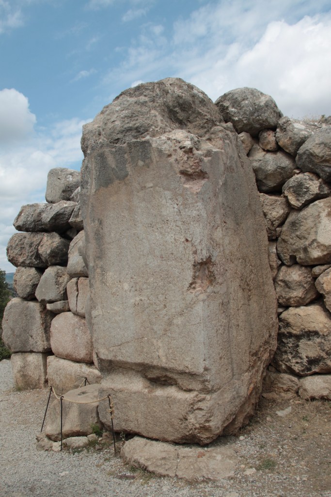 La muraille de Hattusa est pour l’époque extrêmement sophistiquée. Rappelons que nous sommes au 2ème millénaire avant notre ère! Ce sont des murs épais et très solides. Ses fondations sont particulièrement techniques et profondes, d’autant qu’il faut s’adapter à cette topographie montagneuse. La base de la muraille était constituée de gros blocs de pierre bruts, prélevés localement. La partie supérieure s’élevait en briques de terre crue (adobe) enduites. Ces dernières résistant mal au temps, on n’en retrouve plus trace. Elles formaient toutefois de jolies tours et créneaux. La muraille courrait au bas de la cité sur une longueur de près de 6km! On en aperçoit encore bien les fondations. Il s’agissait d’une double muraille, à laquelle s’ajoutait un remblais artificiel que l’on verra un peu plus loin dans notre visite, au niveau de la Porte des Sphinx. Et cette muraille Hittite était percée de 6 portes ou de poternes en encorbellement, fermées par des vantaux en bois. Certaines sont encore très bien conservées et sont sans aucun doute l’atout charme de cette visite!