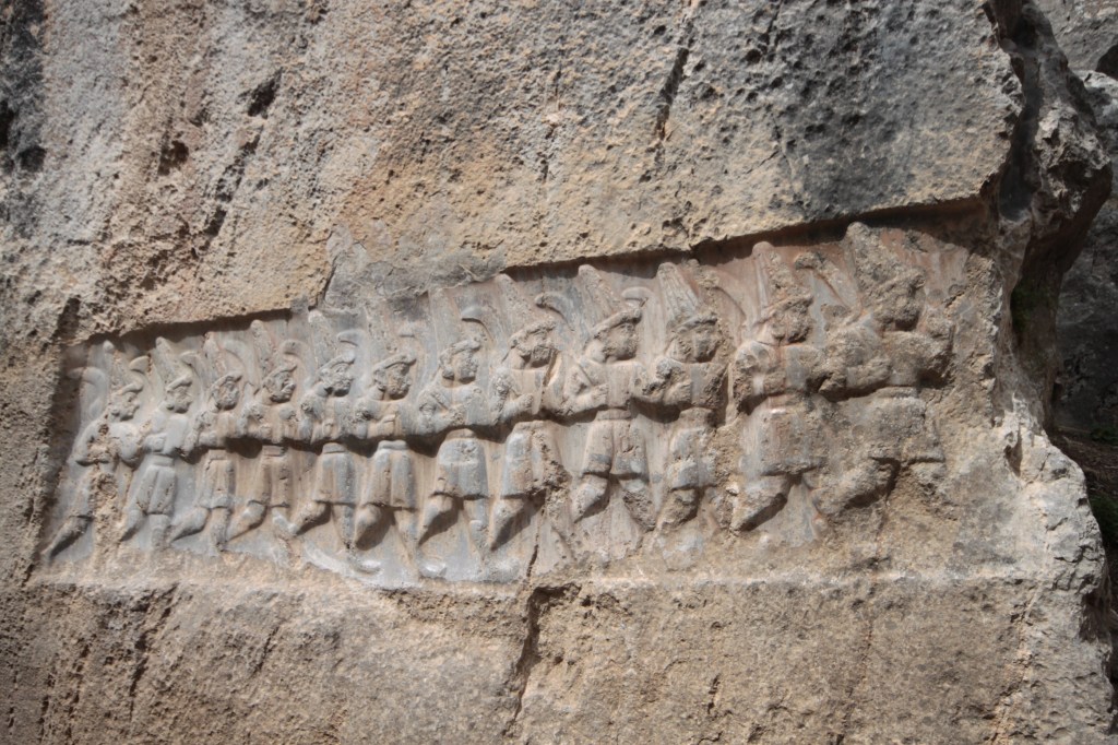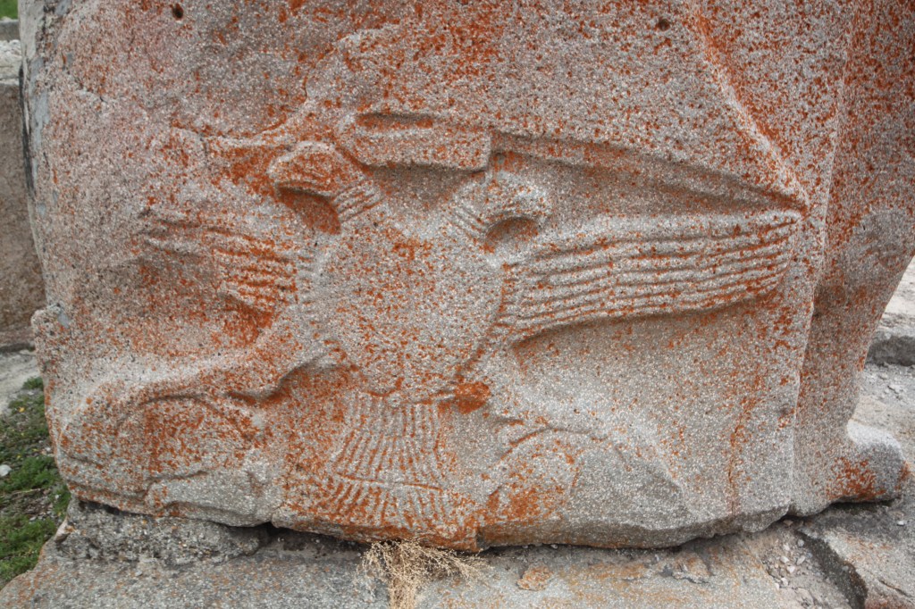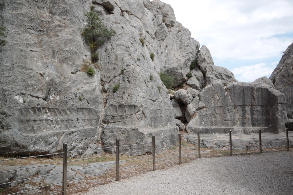 On peut voir ici un exemple de hiéroglyphes Hittites, gravés à l’extérieur de cette paroi de pierre, malheureusement très usée par le temps. Le message n’a pas pu être totalement déchiffré mais il relate la fin du règne de Suppiluliuma II, dernier roi Hittite…