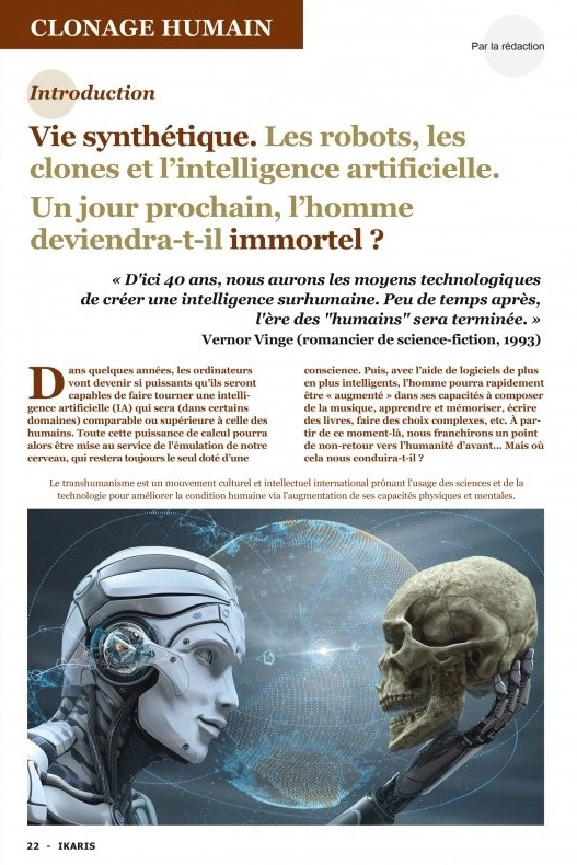 Il existe une technique de transhumanisme très avancée qui n’est pas révélée, laquelle ne cherche qu’à fabriquer le corps parfait, pérenne et complètement anti-humain et anti-éthique ayant pour conséquence la disparition de toute vie naturelle-émotionnelle telle que nous la connaissons, il est question de créatures mi-machines et mi-humaines sans possession personnelle créées par duplication informatisée, ce qui permet de les remplacer par d’autres, s’il le faut.