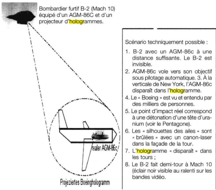 Sur le site http://www.elfterseptember.info vous pouvez voir sur des photos l’ombre d’un bombardier furtif ultrarapide qui aurait pu convoyer la projection en hologramme du Boeing sur les tours jumelles, en plus d’un objet volant Marsch.