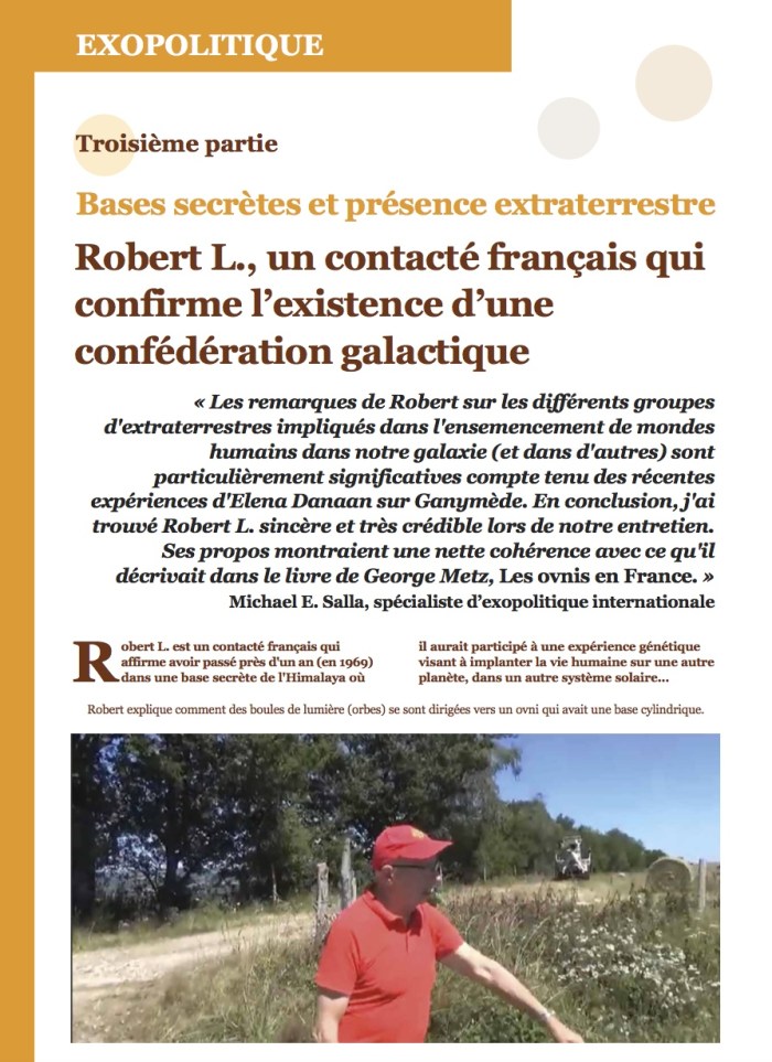 Robert L. est le témoin principal du livre « OVNIS en France » de Georges Metz où, après 2 années de contacts dans sa ferme natale de l’Aveyron avec des extra-terrestres de type humain, il se voit proposer de partir avec eux. Il les accompagne alors dans leur base souterraine secrète située dans l’Himalaya où il se voit enseigner des techniques avancées de yoga et de méditation, et participe à un programme de peuplement avec un guide, une biologiste et une ethnologue. Il reviendra dans sa ferme de l’Aveyron un an plus tard, mais devra attendre 40 ans avant de divulguer son histoire extraordinaire.