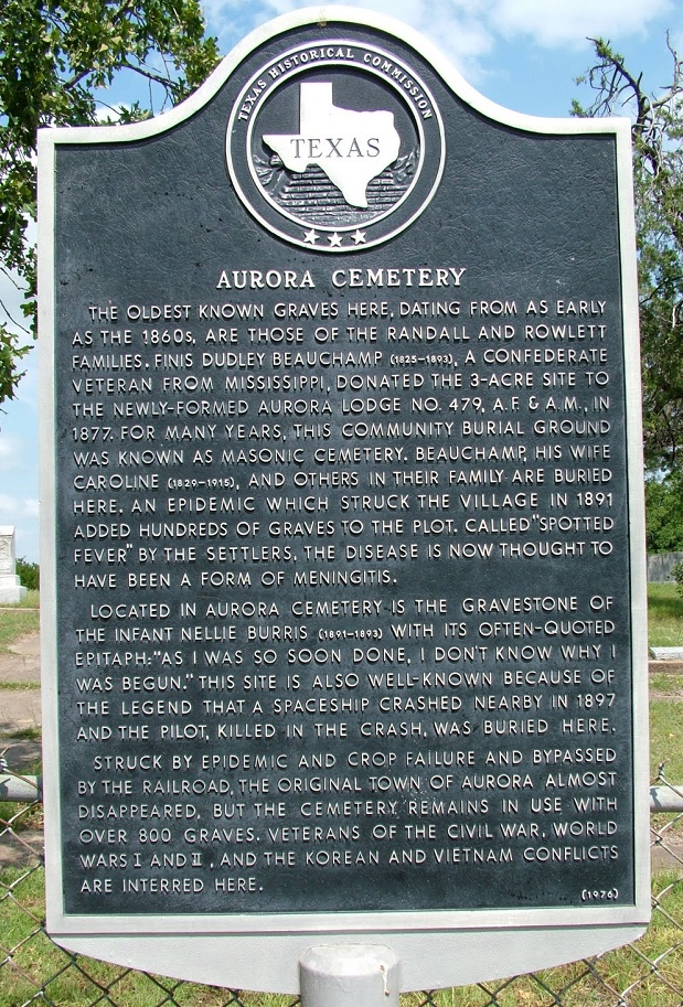 Le cimetière d’Aurora fût fondé en 1861, au tout début de la guerre de sécession. La Commission d’histoire de l’État du Texas a indiqué que le cimetière était célèbre en raison de la légende selon laquelle un vaisseau spatial s’était écrasé à proximité, en 1897, et que le pilote tué dans l’accident avait été enterré ici.