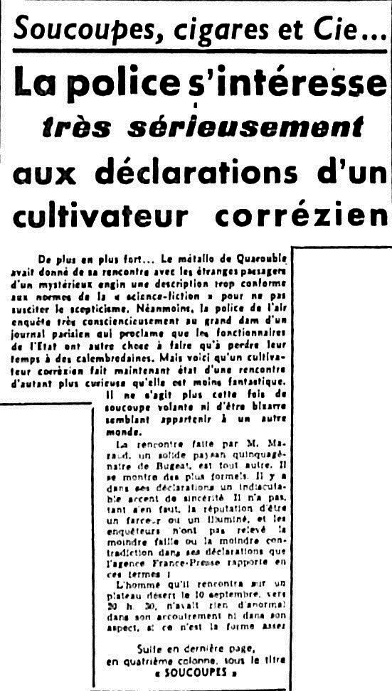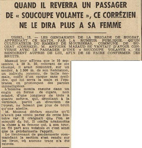 USSEL, 13. — LES GENDARMES DE LA BRIGADE DE BUGEAT, APPRENANT, CE MATIN, PAR LA RUMEUR PUBLIQUE, QU’UN CULTIVATEUR DU HAMEAU DE MOURIERAS, COMMUNE DE BUGEAT (CORREZE), M. ANTOINE MAZAUD SE VANTAIT D’AVOIR CONVERSE AVEC LE PASSAGER D’UNE « SOUCOUPE VOLANTE », SE RENDIRENT AUPRES DE LUI, AFIN DE SE FAIRE CONFIRMER CES BRUITS.