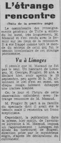 Il semble bien que M. Mazaud ne fut pas le seul. Un habitant de Limoges, M. George Frugier, 30 ans, a déclaré hier, avoir aperçu le 10 septembre, peu après 20 h. 30, sillonnant le ciel d’est en ouest, un disque rouge laissant échapper une traînée bleutée.