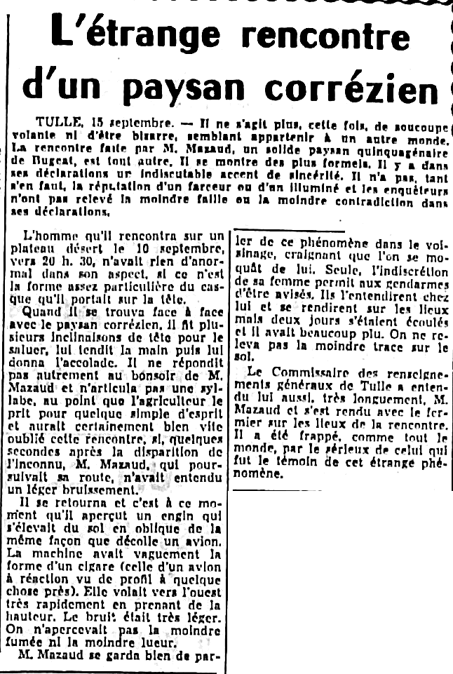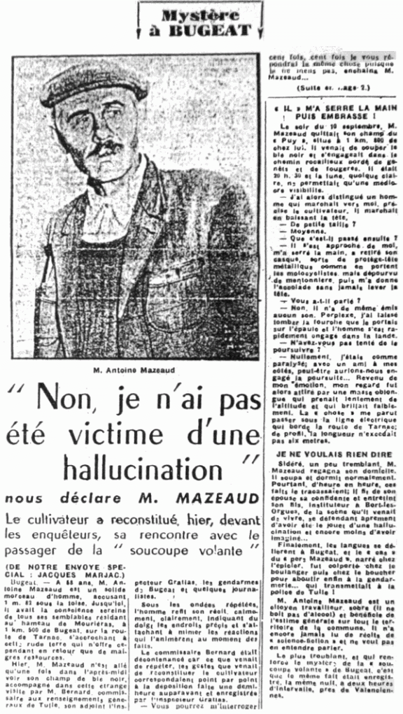 Il ne s’agit plus cette fois de soucoupe volante ni d’être bizarre semblant appartenir à un autre monde. La rencontre faite par M. Mazaud, un solide paysan quinquagénaire de Bugeat (Corrèze), est tout autre. Il se montre des plus formel. Il y a dans ses déclarations un indiscutable accent de sincérité. Il n’a pas, tant s’en faut, la réputation d’un farceur ou d’un illuminé, et les enquêteurs n’ont pas relevé la moindre faille où la moindre contradiction dans ses déclarations.