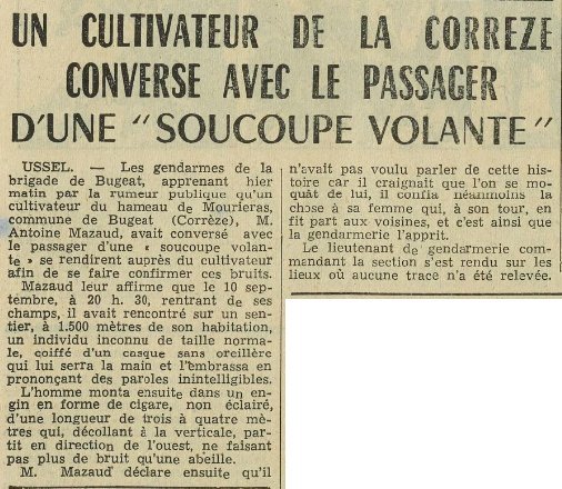 Une information indique que les gendarmes de la brigade de Bugeat, informé par la rumeur publique, qu’un cultivateur du hameau de Mouriéras, commune de Bugeat (Corrèze), M. Antoine Mazaud, avait conversé avec le passager d’une « soucoupe volante », se rendirent auprès du cultivateur afin de se faire confirmer ces bruits.
