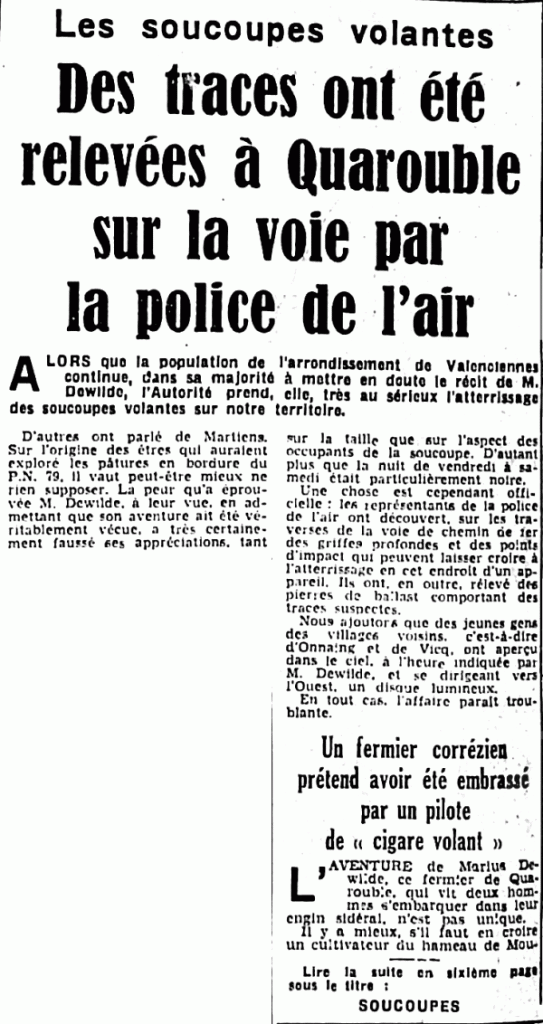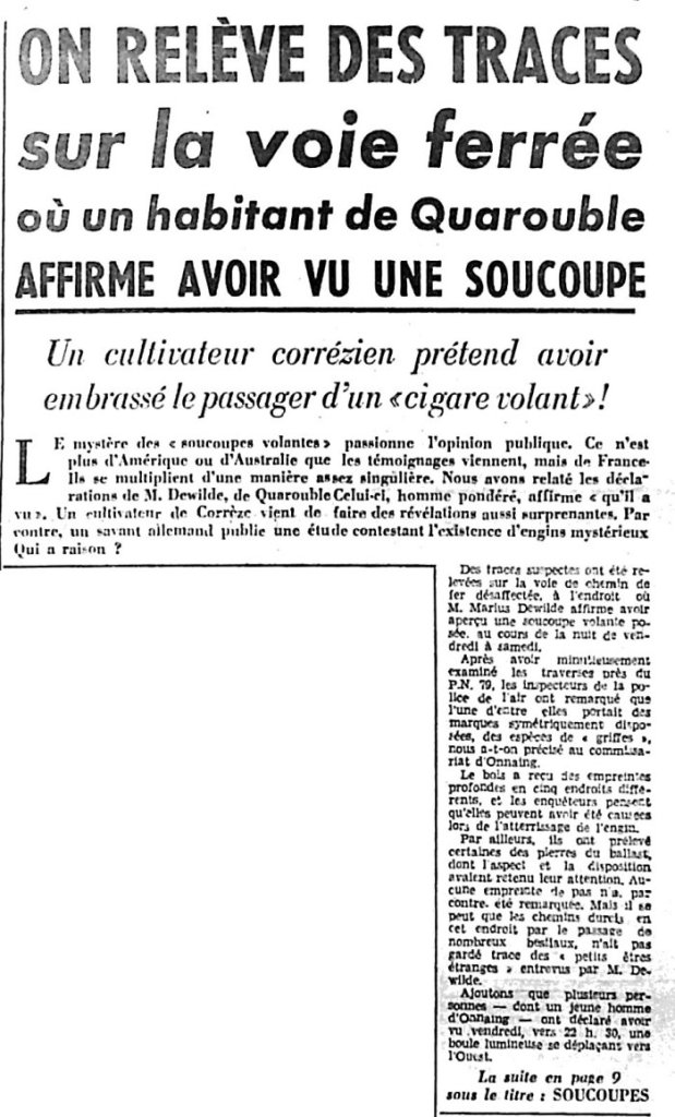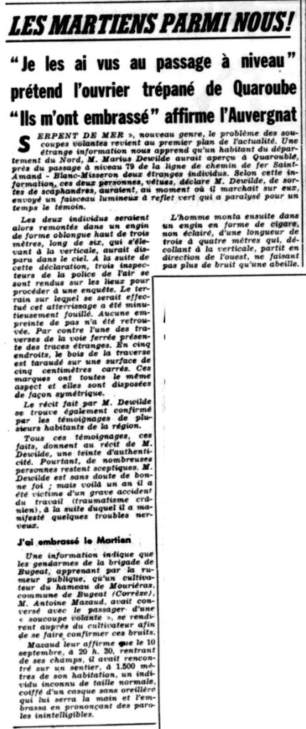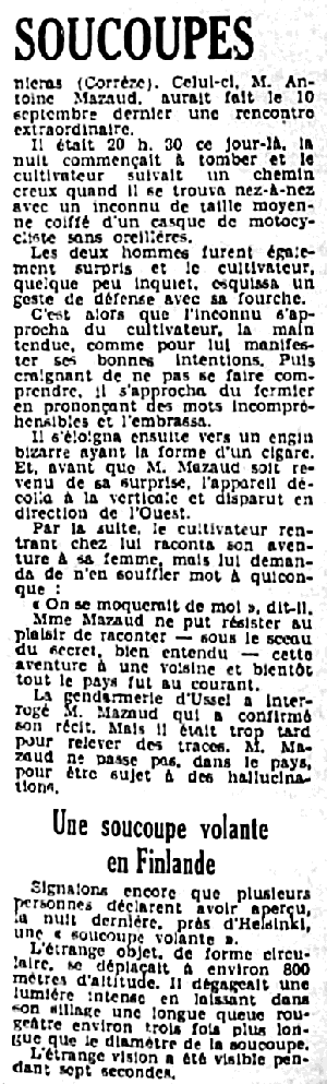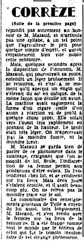 Voici que maintenant c’est, après l’habitant de deux Tuarenge [sic] nord), M. Dewilde, qui a vu des petits êtres étranges disparaître à bord d’une « soucoupe volante », un habitant de Mouriéras, en Corrèze (M. Mazaud), qui a vu un de ces passagers étonnants. Mais il a fait mieux. Il a eu le privilège de converser avec lui et de lui serrer la main.